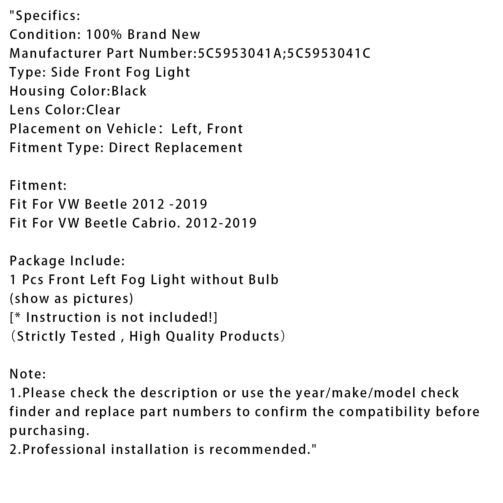 1 pz. Paraurti anteriore sinistro fendinebbia senza lampadina per VW Beetle 12-19 5C5953041A