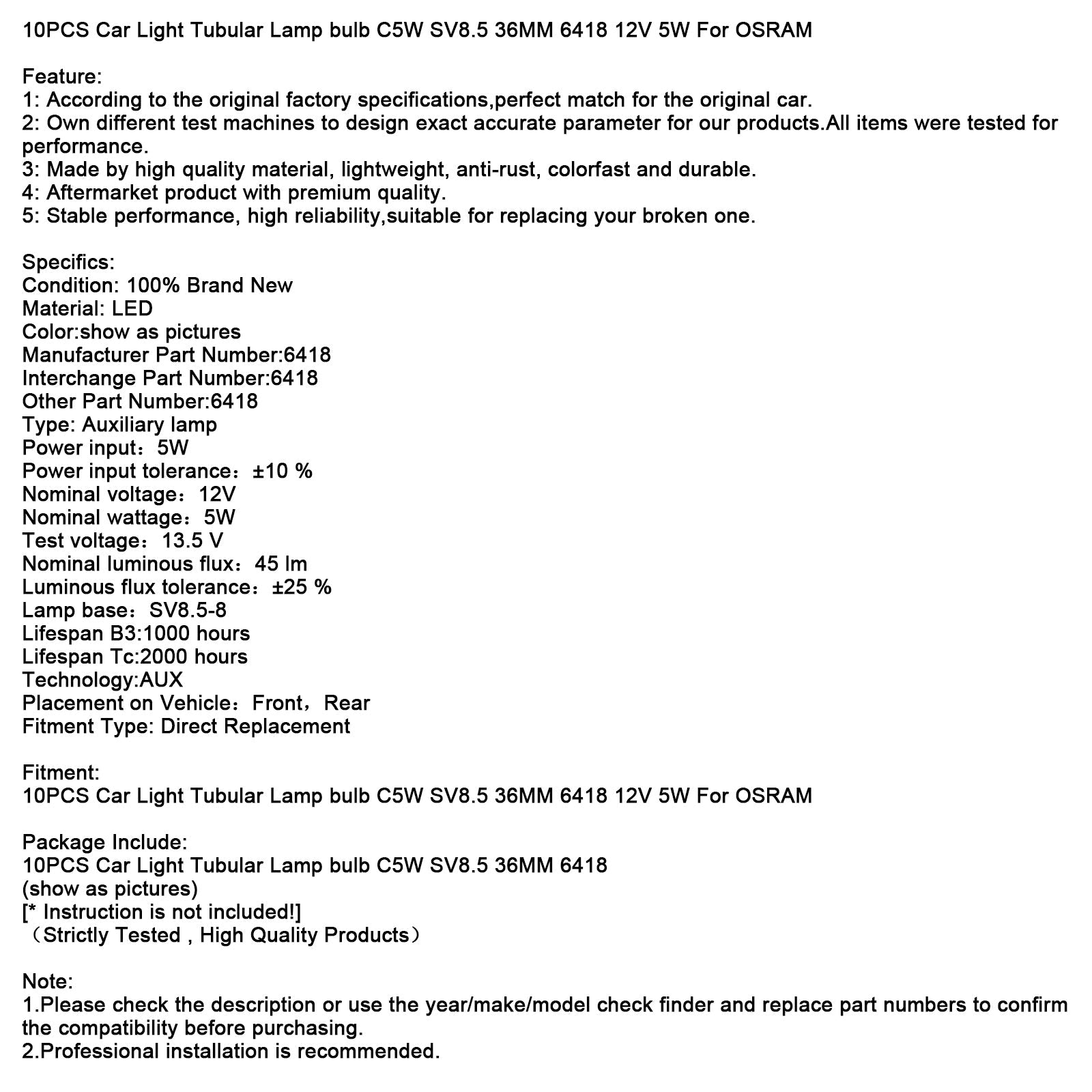 Lampadina tubolare per auto, 10 pezzi, C5W SV8.5 36 mm, 6418, 12 V, 5 W, per OSRAM