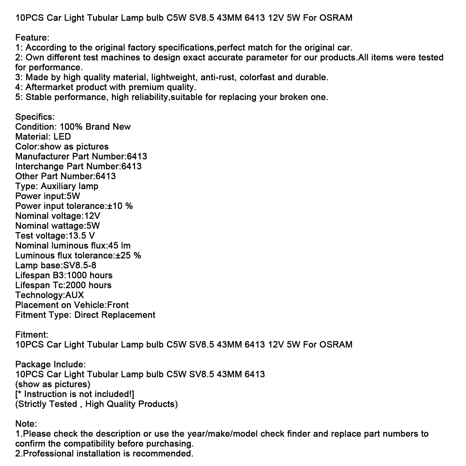 10 lampadine tubolari per auto C5W SV8.5 43MM 6413 12V 5W per OSRAM