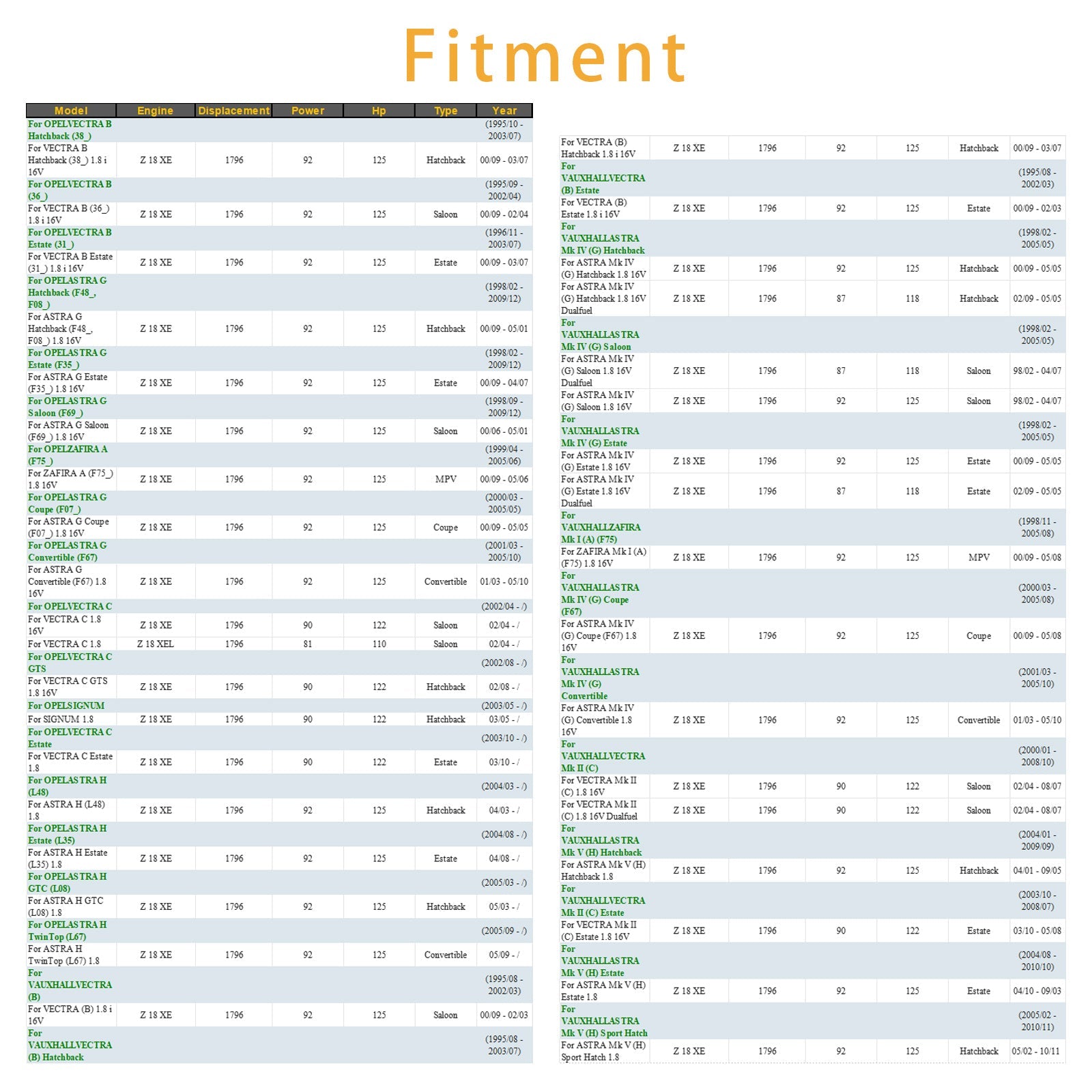 Adatto per VECTRA Mk II (C) Station Wagon 1.8 16V 2003/10 - 2005/08
