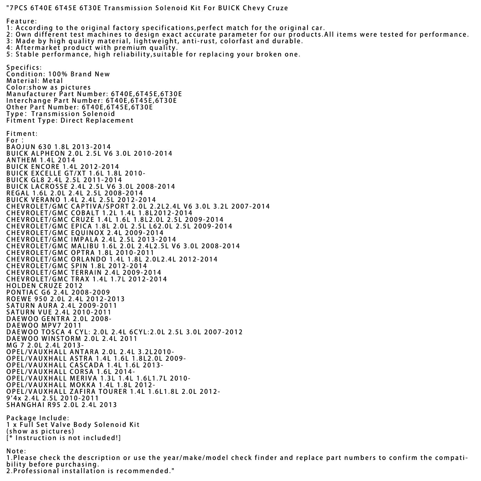Kit solenoide trasmissione 7 pezzi 6T40E 6T45E 6T30E adatto per BUICK Chevy Cruze