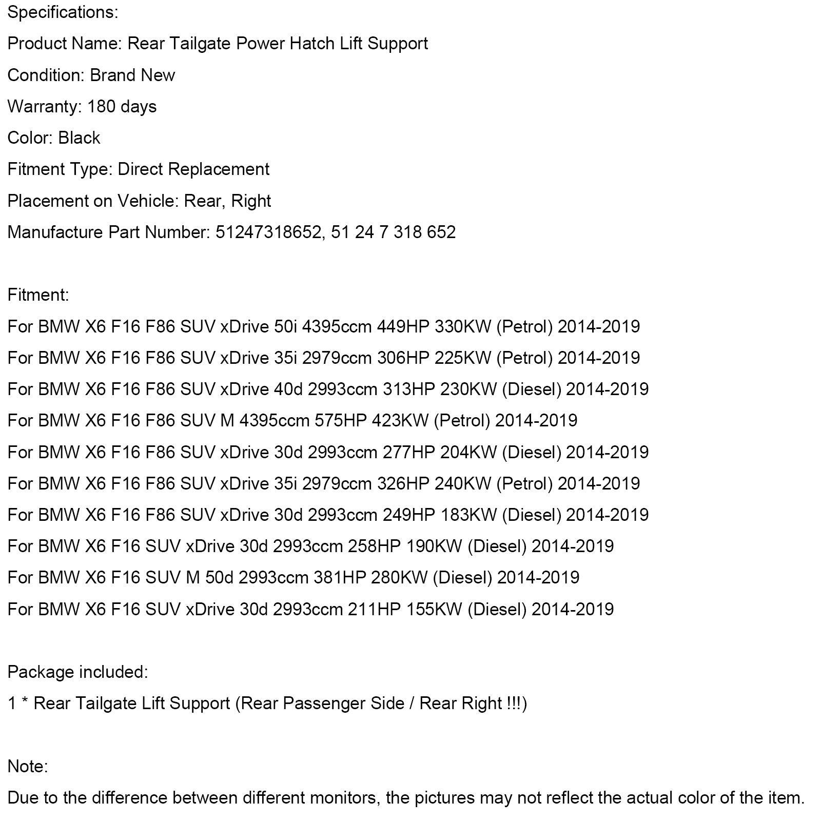 Supporto di sollevamento elettrico del portellone posteriore destro 51247318652 adatto per BMW X6 F16 F86 2014-2019