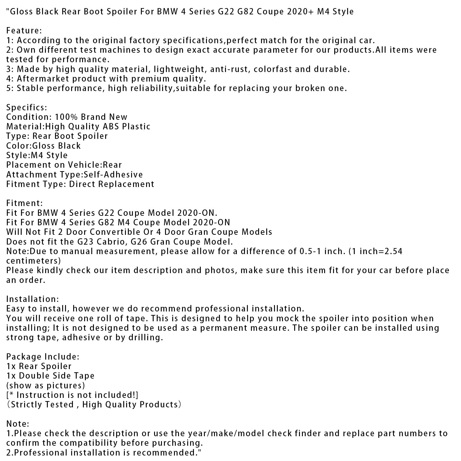 Spoiler posteriore nero lucido adatto per BMW Serie 4 G22 G82 Coupé 2020+ stile M4