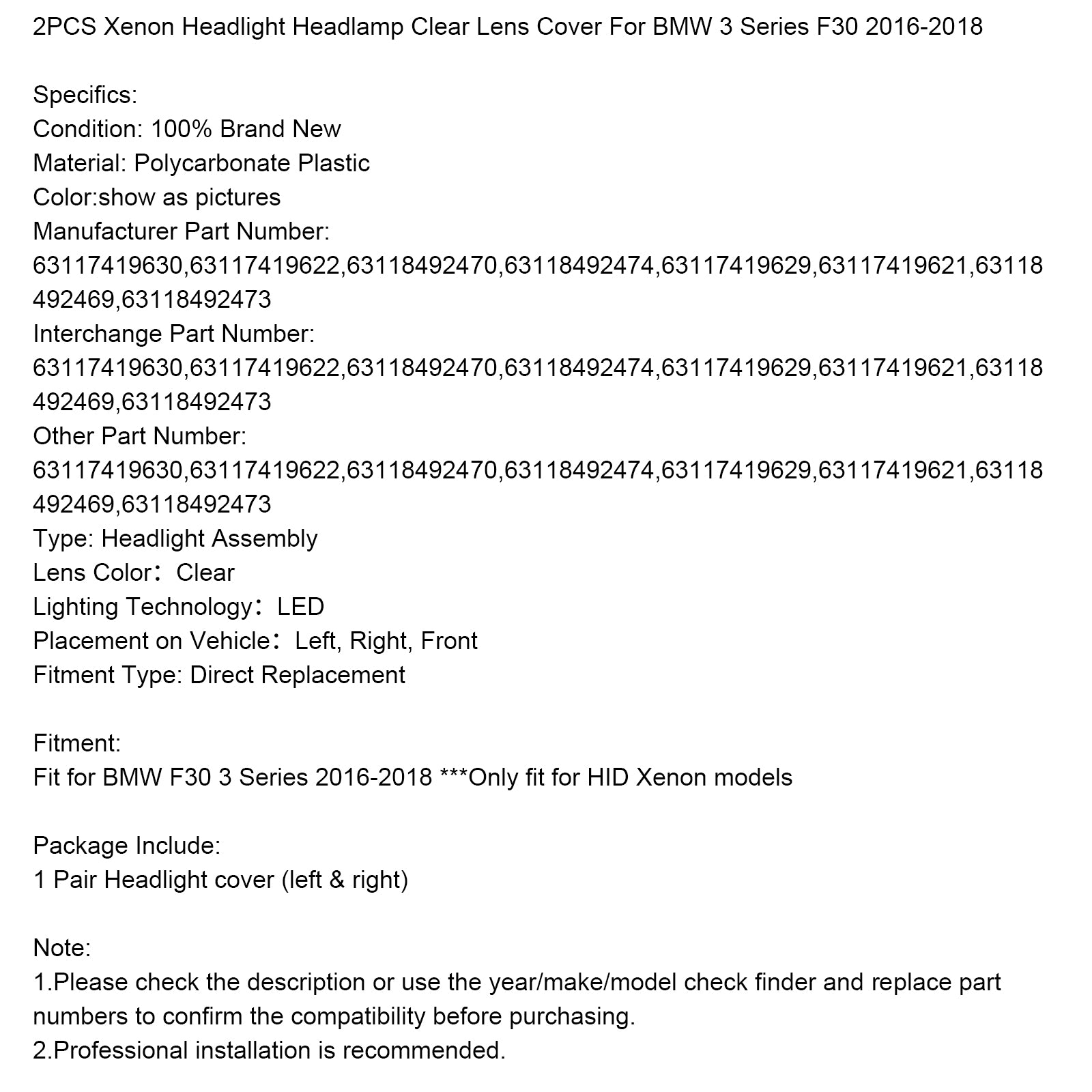 Copri lente trasparente per fari allo xeno (2 pezzi) per BMW Serie 3 F30 2016-2018