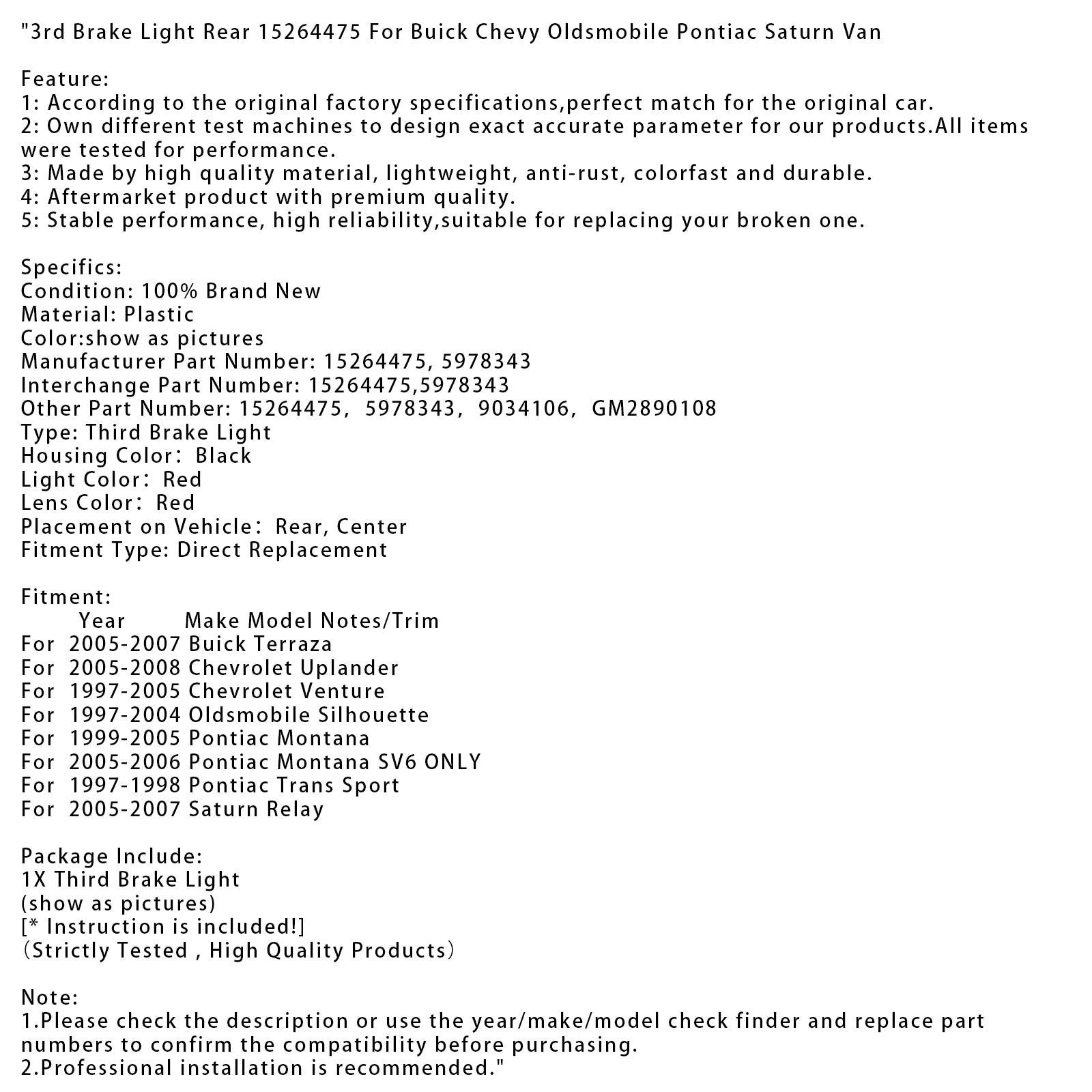 Terza luce freno posteriore 15264475 per Buick Chevy Oldsmobile Pontiac Saturn Van