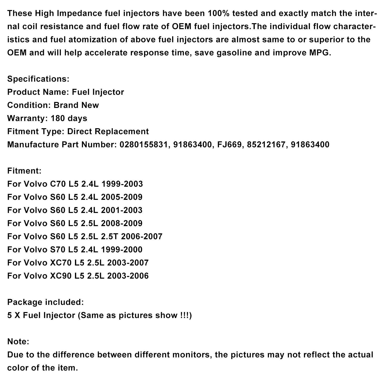 Iniettore di carburante 5 pezzi 0280155831 adatto per Volvo S60 S80 C70 XC90 2.4L 2.5L 1998-2009