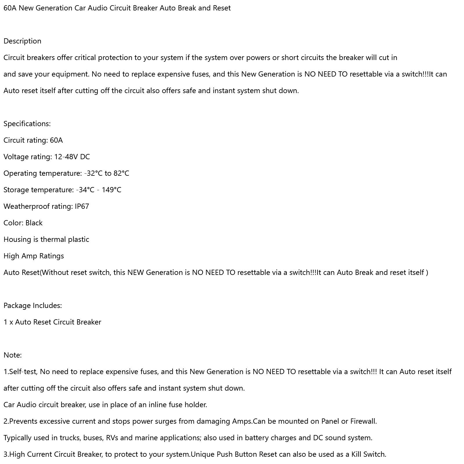 Fusibile interruttore automatico 60A AMP 12-48V DC Interruttore di ripristino automatico per barca per auto IP67