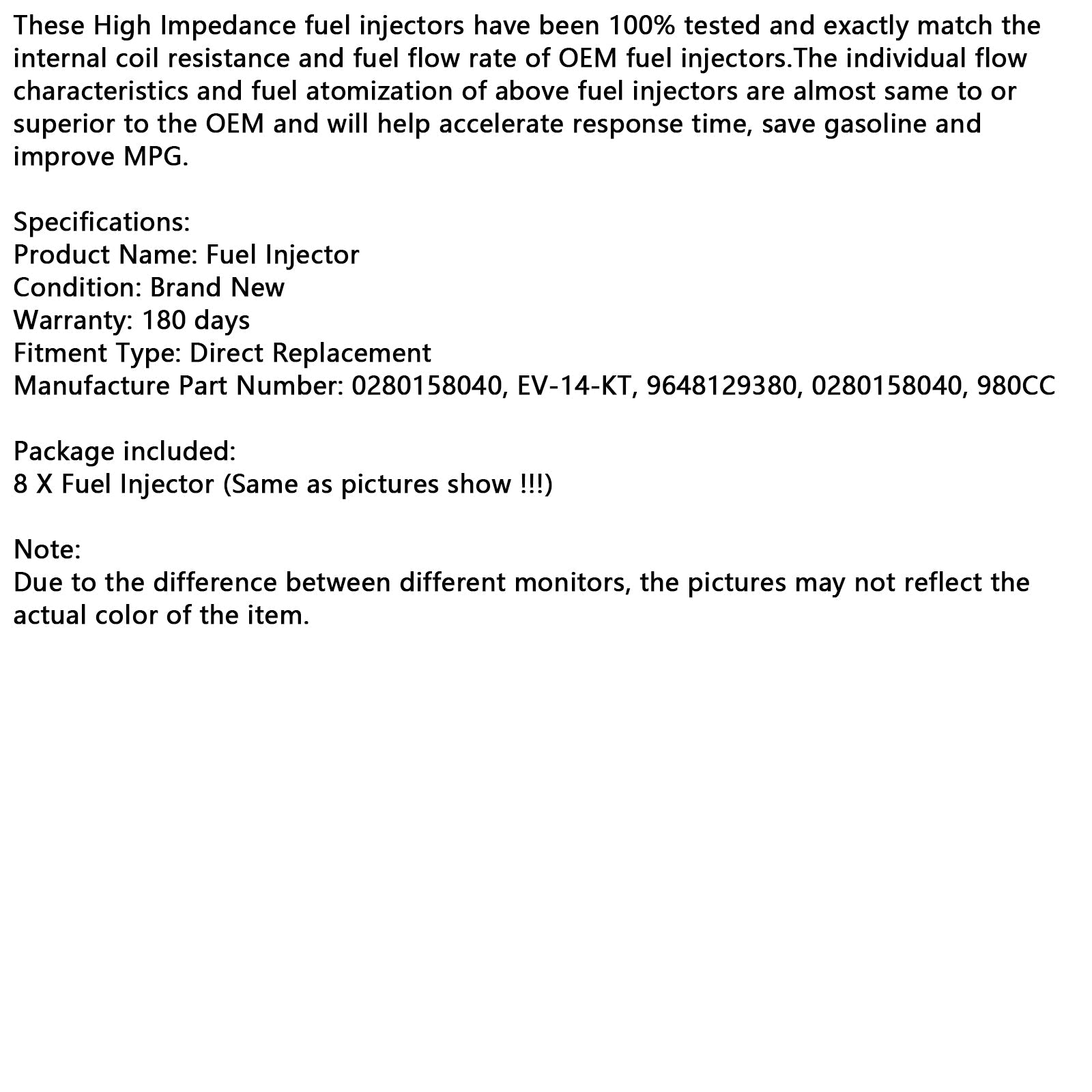 Questi iniettori di carburante ad alta impedenza sono stati testati al 100% e corrispondono esattamente alla resistenza interna della bobina e alla portata del carburante degli iniettori di carburante OEM. Le singole caratteristiche di flusso e l'atomizzazione del carburante degli iniettori di carburante sopra indicati sono quasi uguali o superiori a quelle degli OEM e contribuiranno ad accelerare i tempi di risposta, a risparmiare benzina e a migliorare i consumi.