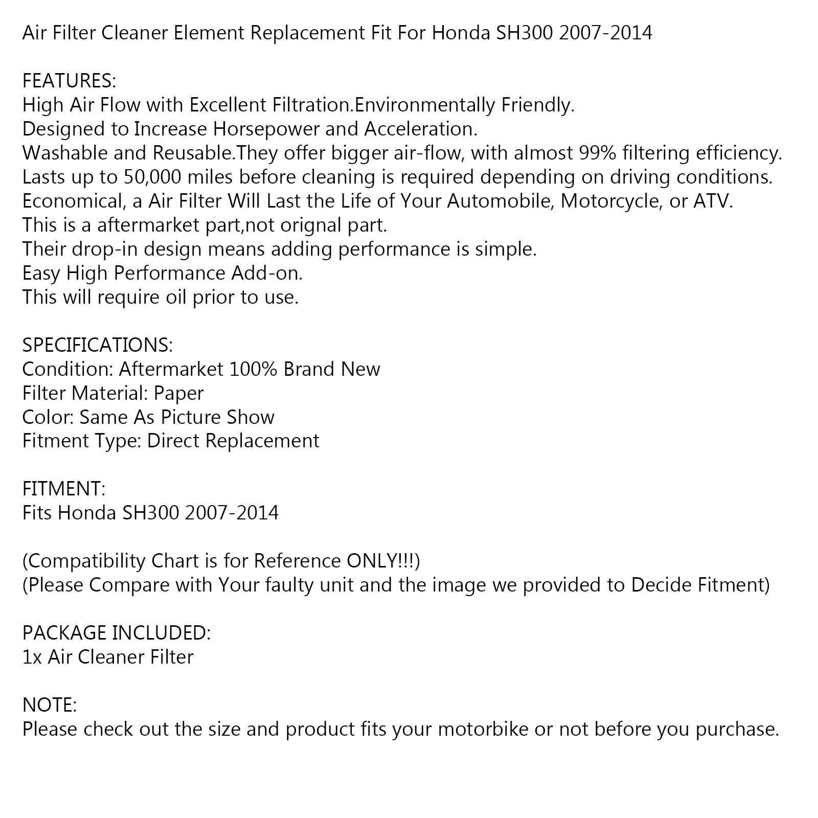 Filtro aria Cleaner per Honda SH300 SH 300 2007 2008 2009 2010-2014 17210-KTW-900 Generico