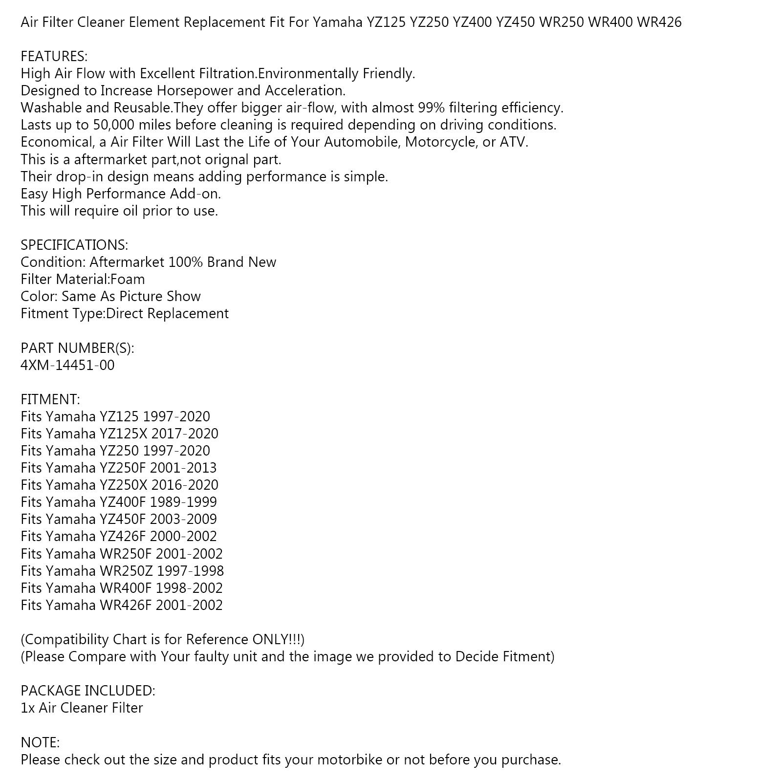 Filtro dell'aria Cleaner Element Fit di ricambio per Yamaha YZ125 YZ250 YZ400 YZ450 WR250 WR400 WR426