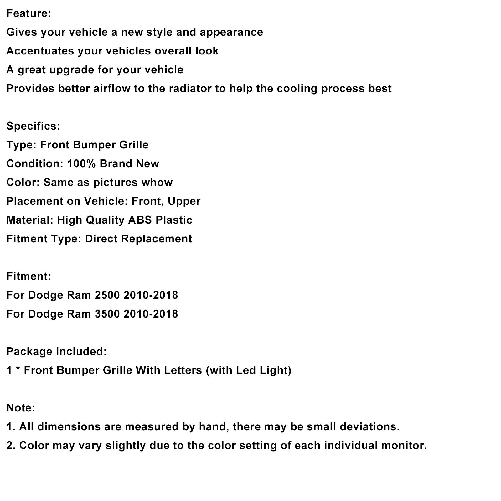 Griglia paraurti anteriore nera adatta per Ram 2500/3500 Laramie 2010-2018 con luce a LED