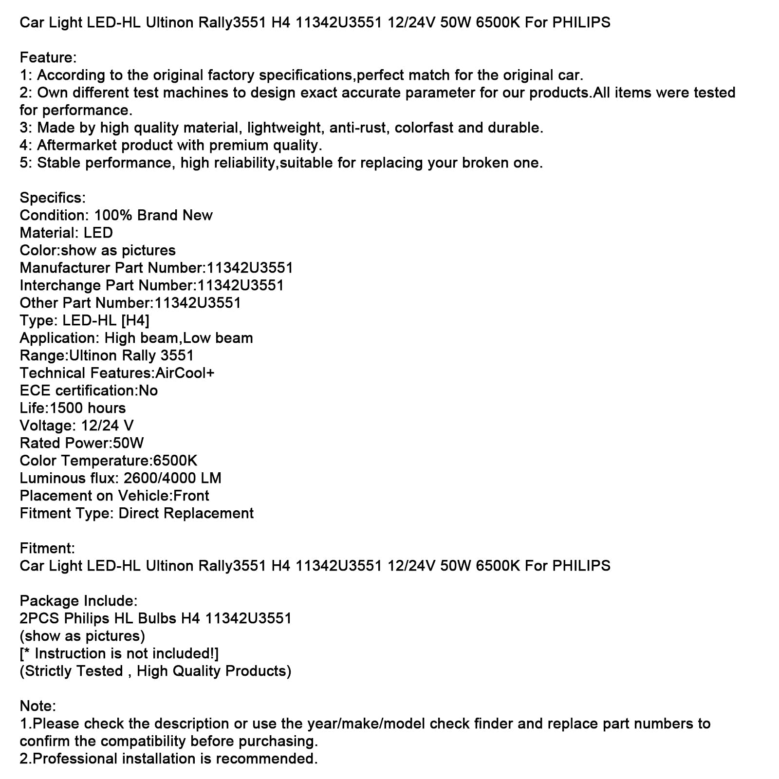 Luce auto LED-HL Ultinon Rally3551 H4 11342U3551 12/24V 50W 6500K per PHILIPS