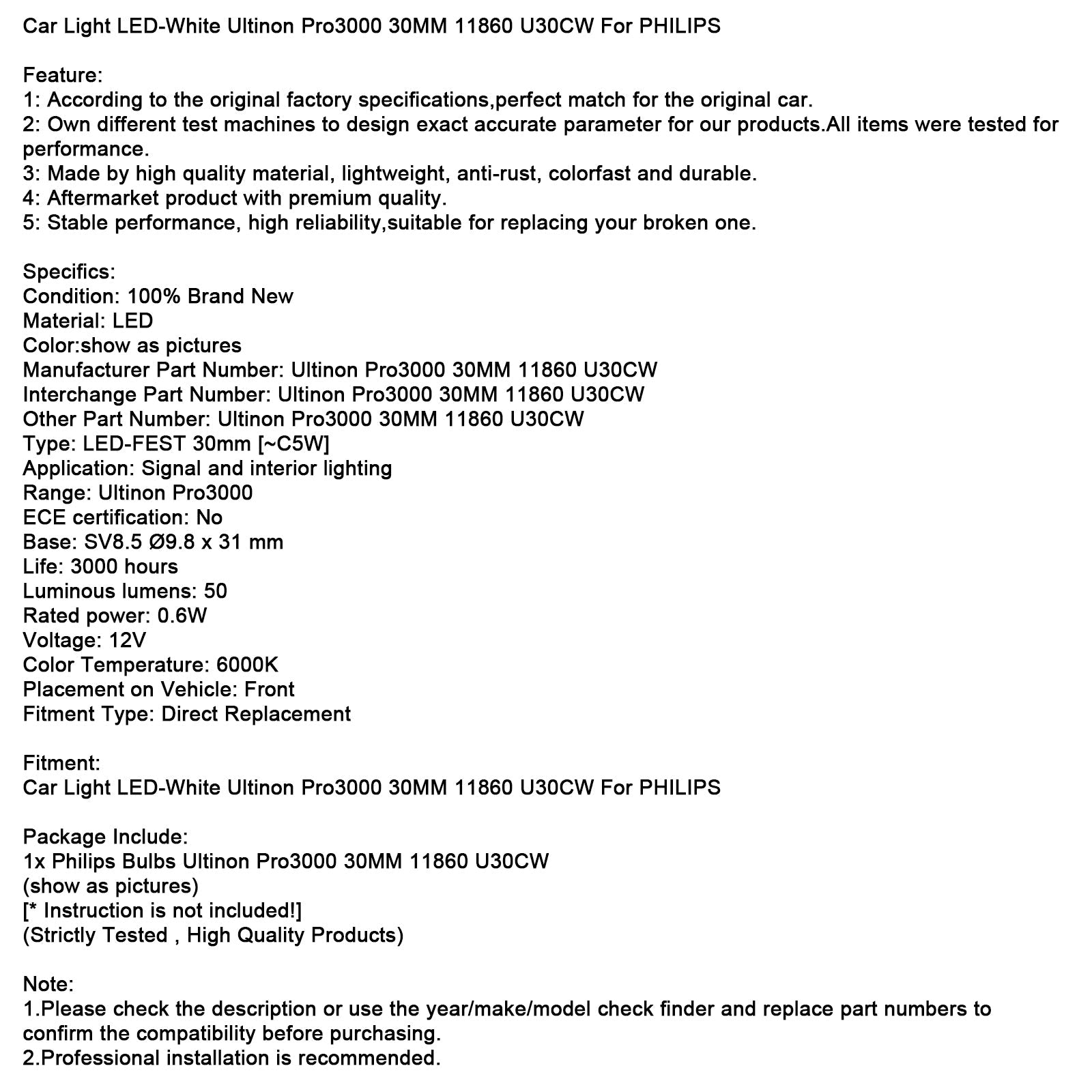 1x lampadine Philips Ultinon Pro3000 30MM 11860 U30CW