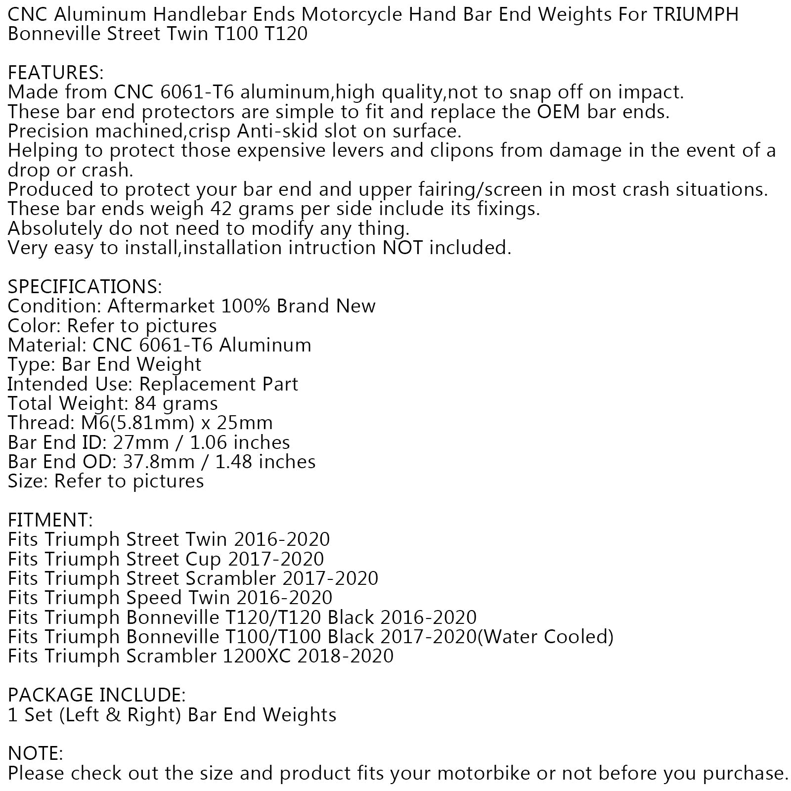 Manubrio in alluminio CNC Estremità Moto Manubrio Pesi finali per TRIUMPH Bonneville Street Twin T100 T120