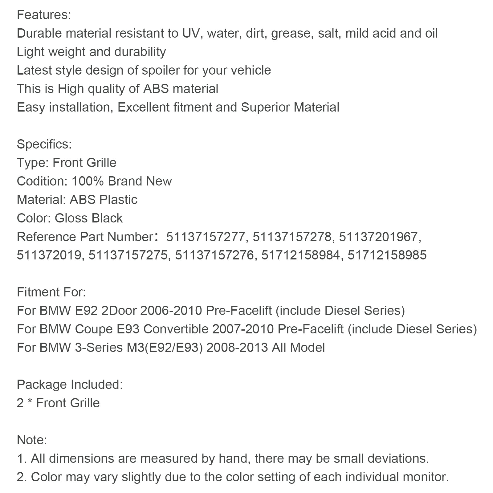 Per BMW E92 2 porte 2006-2010 pre-restyling (inclusa la serie Diesel)