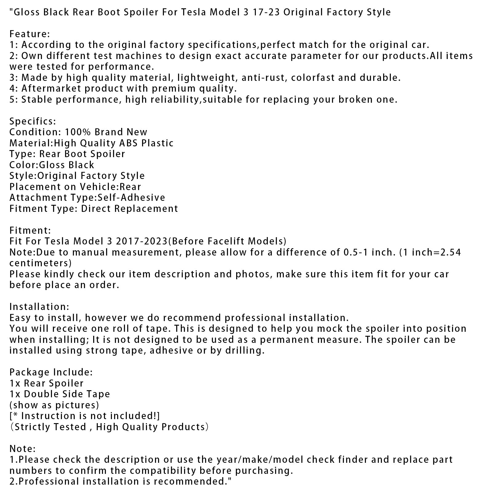 Spoiler posteriore nero lucido per Tesla Model 3 17-23, stile originale di fabbrica