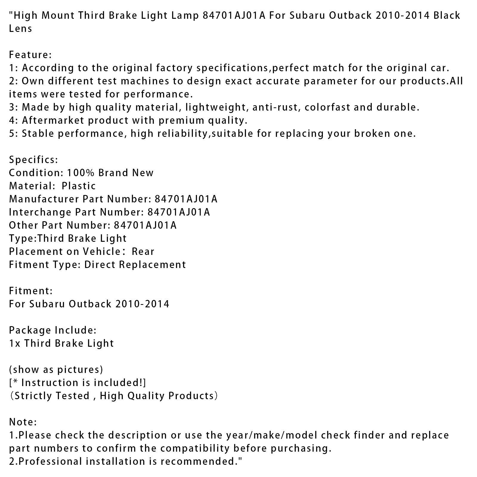 Lampada terza luce freno a montaggio alto 84701AJ01A per Subaru Outback 2010-2014, lente nera