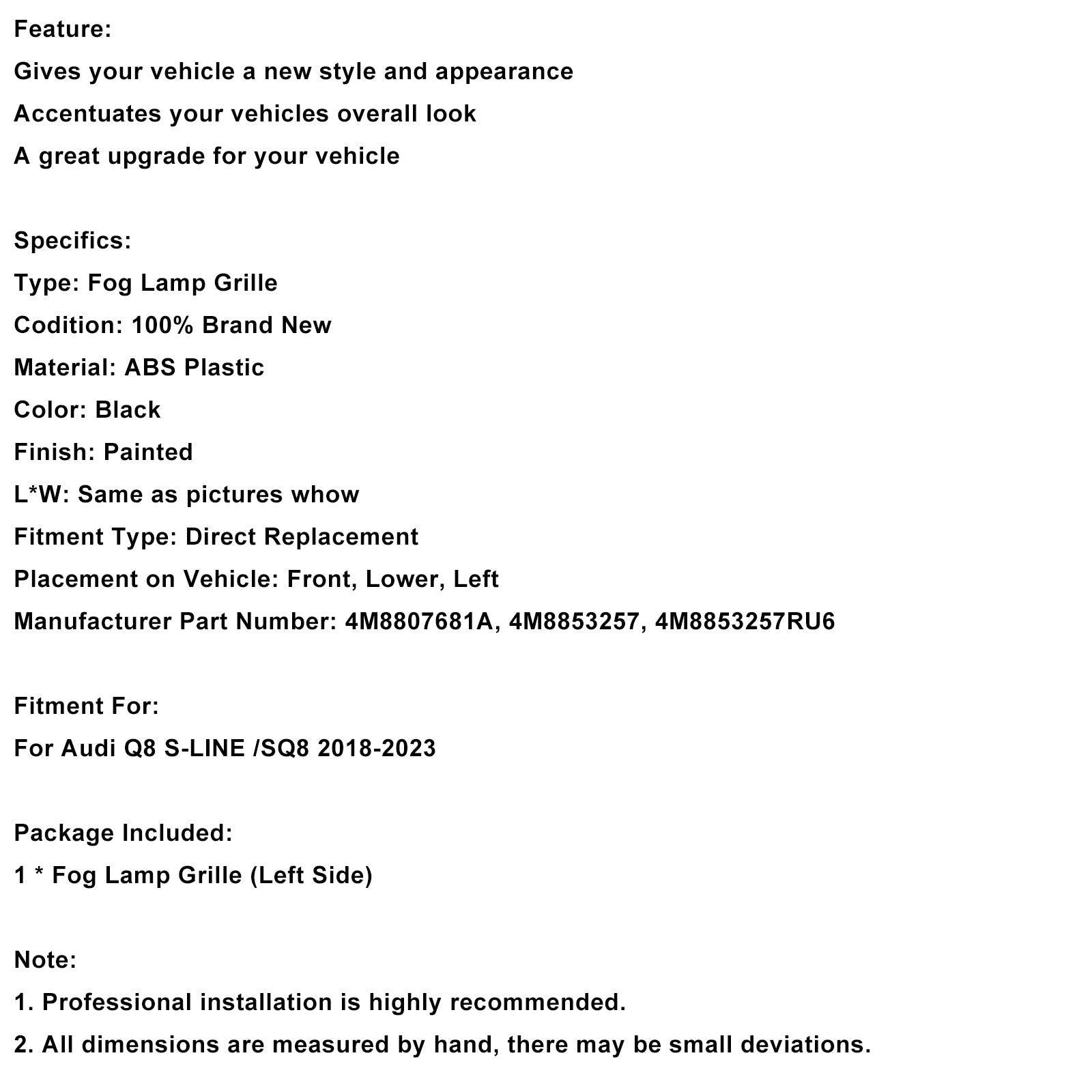 Griglia paraurti anteriore sinistra Audi Q8 S-Line SQ8 2018-2023 4M8807681A
