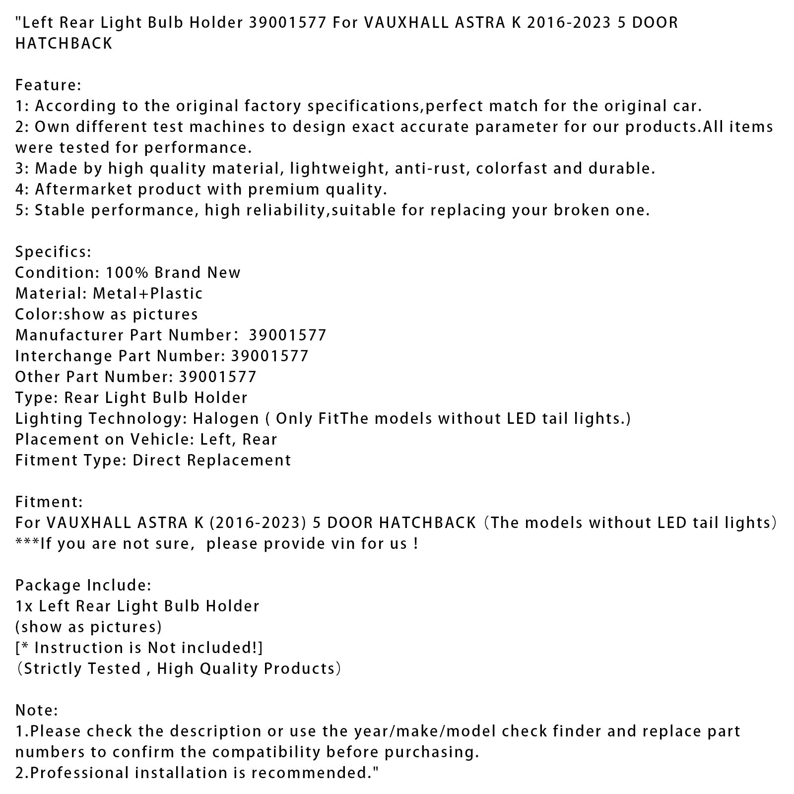 Portalampada luce posteriore sinistra 39001577 per VAUXHALL ASTRA K 2016-2023 5 PORTE HATCHBACK