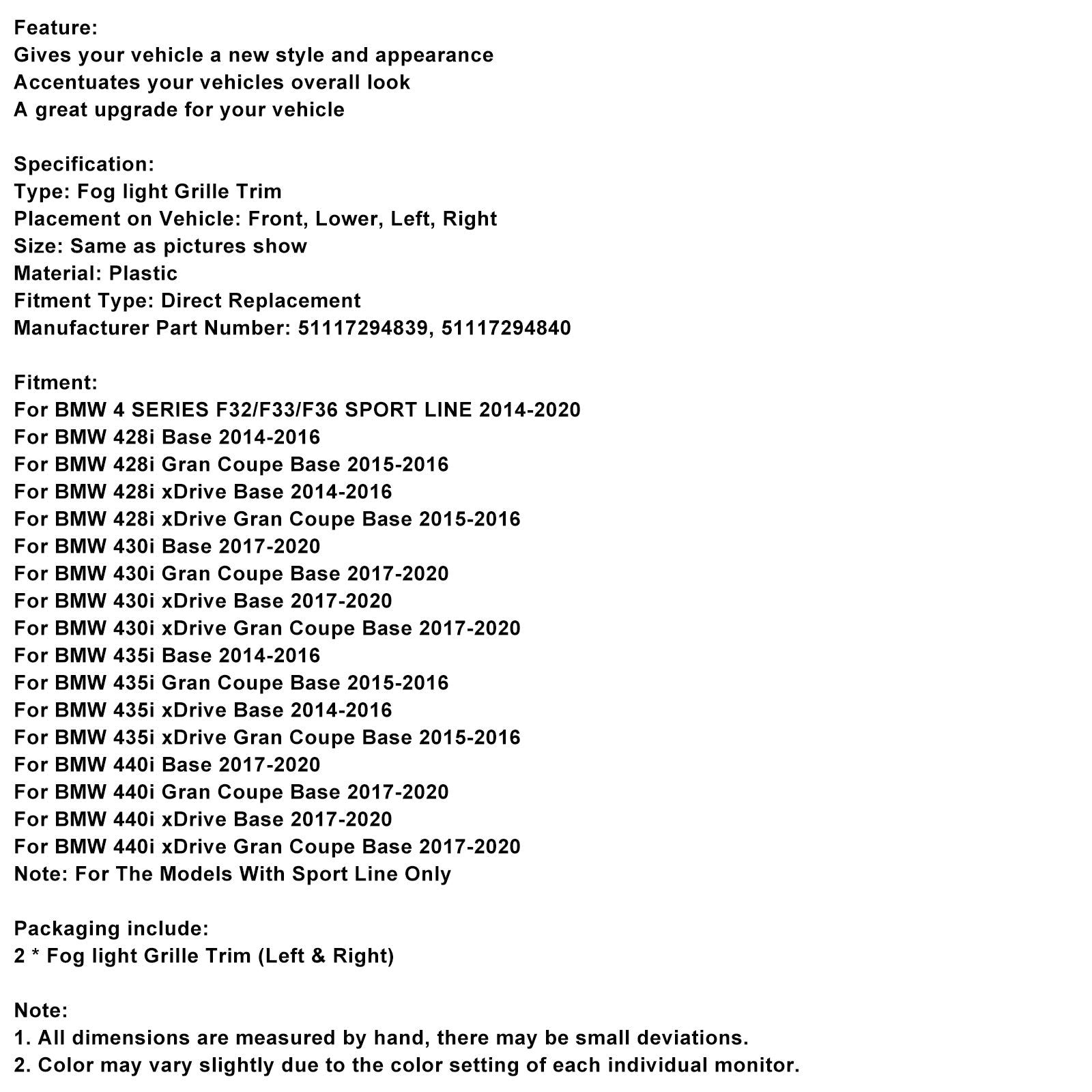 Griglia per paraurti anteriore con cornice fendinebbia sinistra e destra adatta per BMW 428i F32 F33 F36