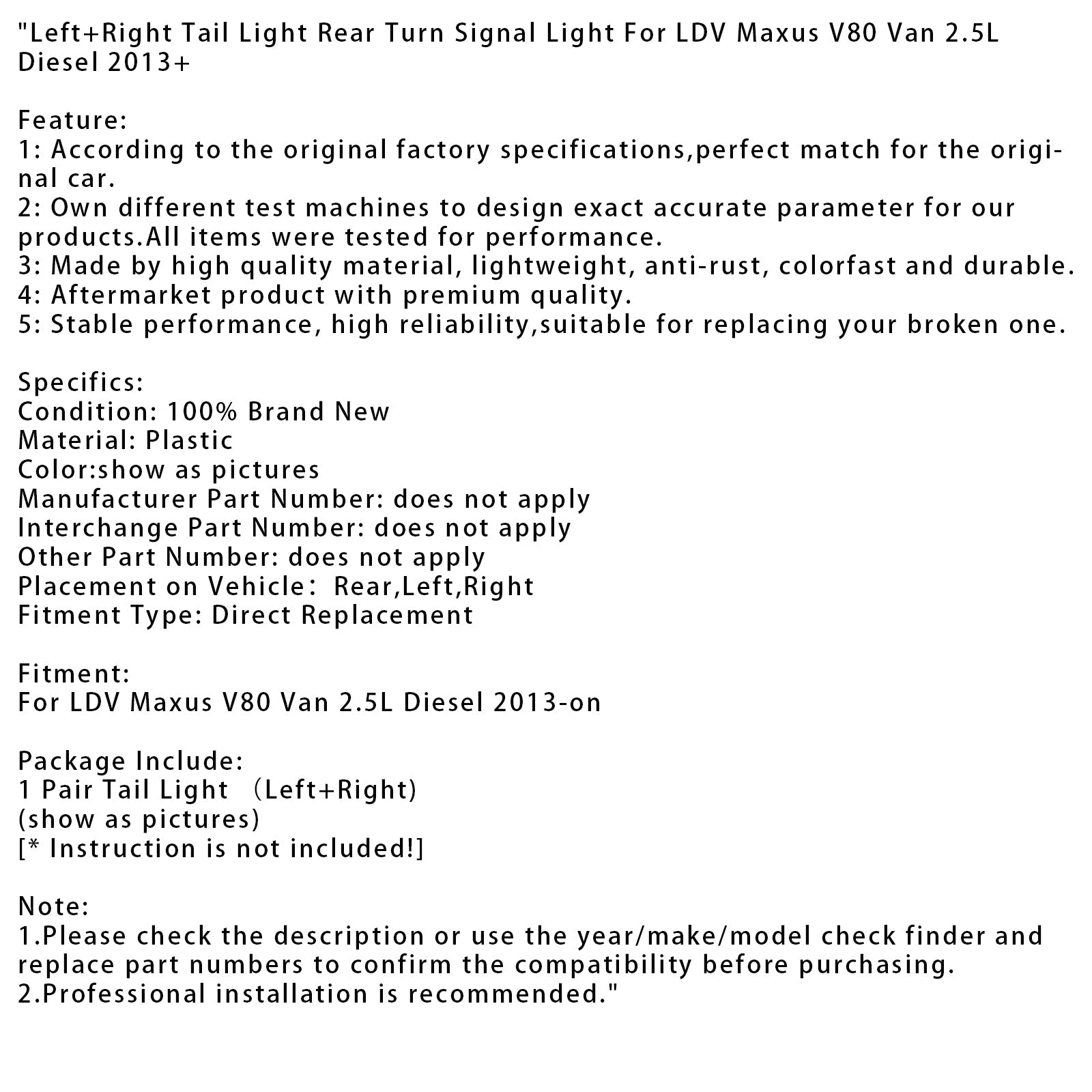 Fanale posteriore sinistro + destro Indicatore di direzione posteriore per LDV Maxus V80 Van 2.5L Diesel 2013+