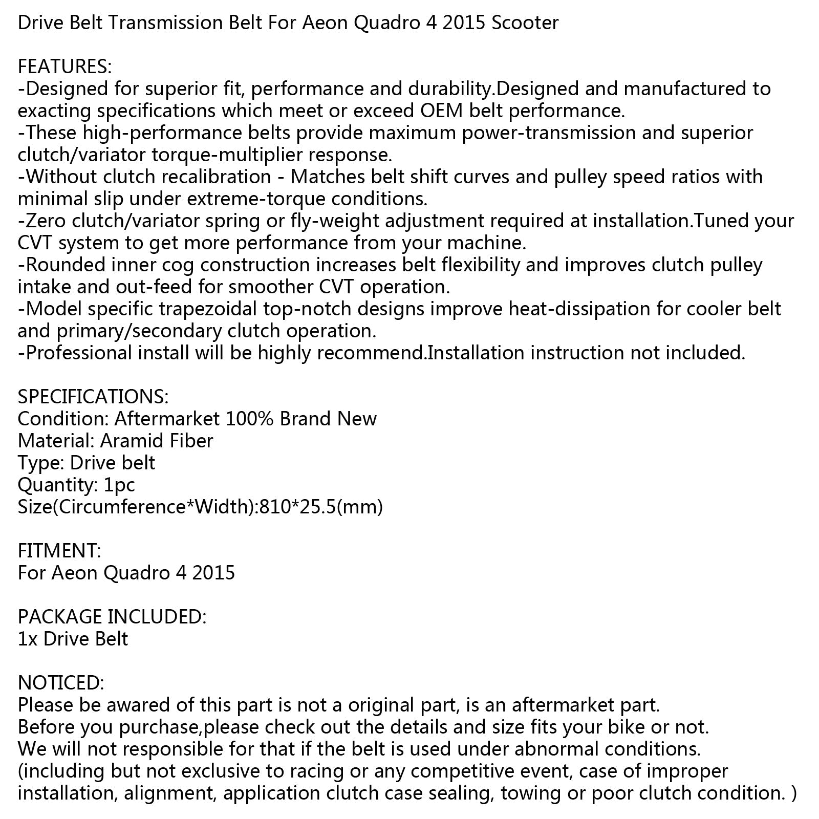 Cinghia di trasmissione di ricambio per motore scooter a quattro ruote Aeon Quadro 4 2015 346cc generico