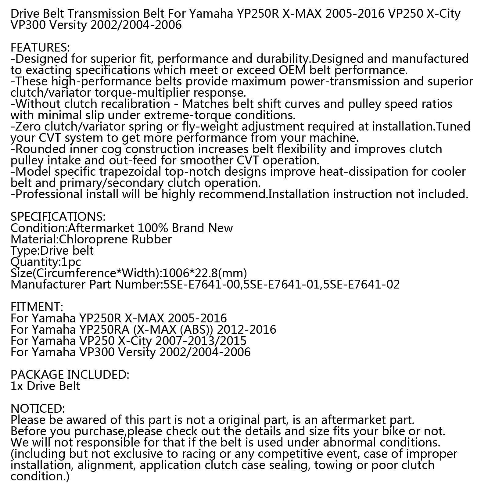 Cinghia di trasmissione per Yamaha X-City VP125 X-MAX YP125 R RA Versity VP300 02-16 Scooter Generico