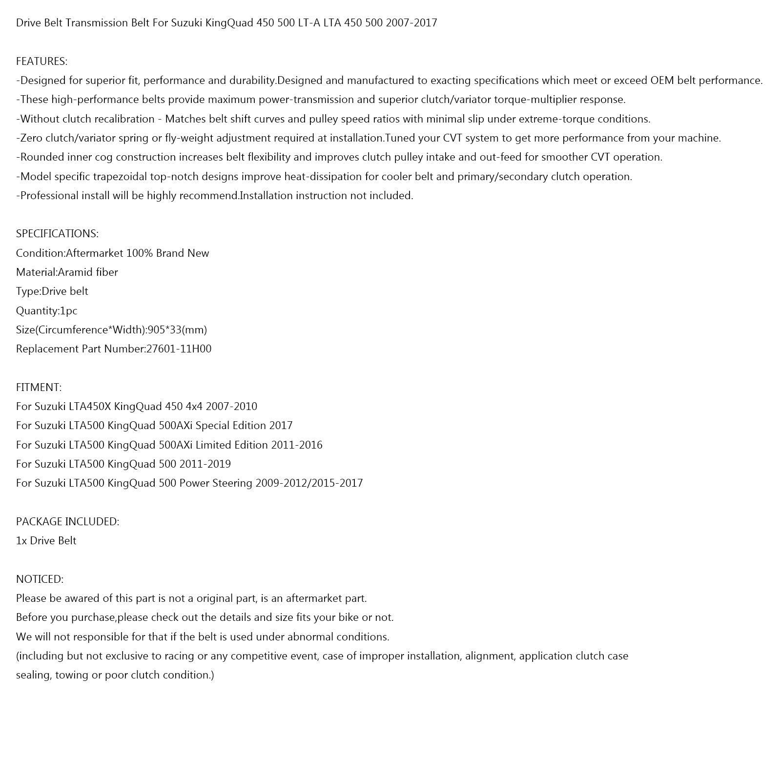 Cinghia di trasmissione 905OC x 33W Per Suzuki LTA500 LTA450X KingQuad 500 450 2007-2017 Generico