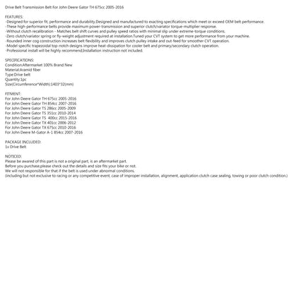 Cinghia di trasmissione per John Deere Gator TH 675cc 2005-2016 854cc TS 400cc 351cc 2016 Generico
