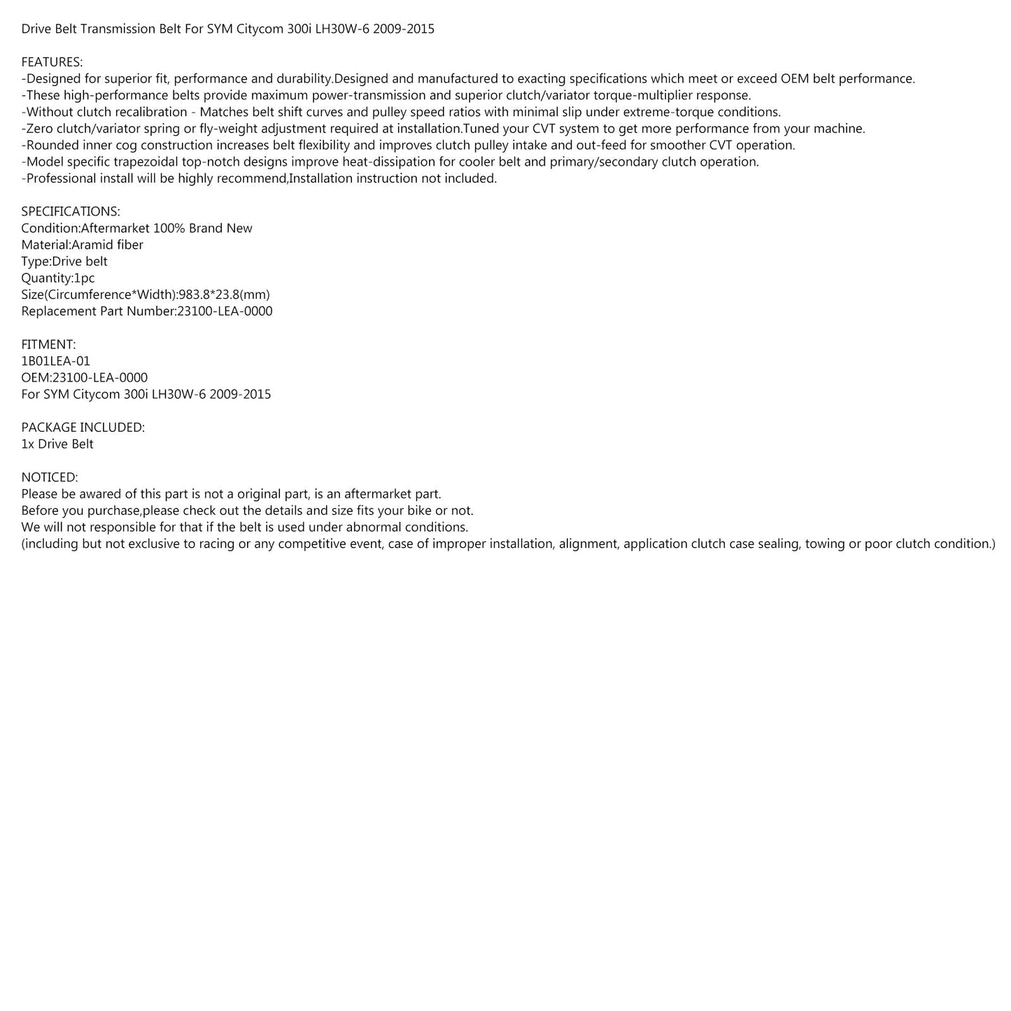 Cinghia di trasmissione del motore 1B01LEA-01 per 23100-LEA-0000 SYM Citycom 300i LH30W-6 09-15 Generico
