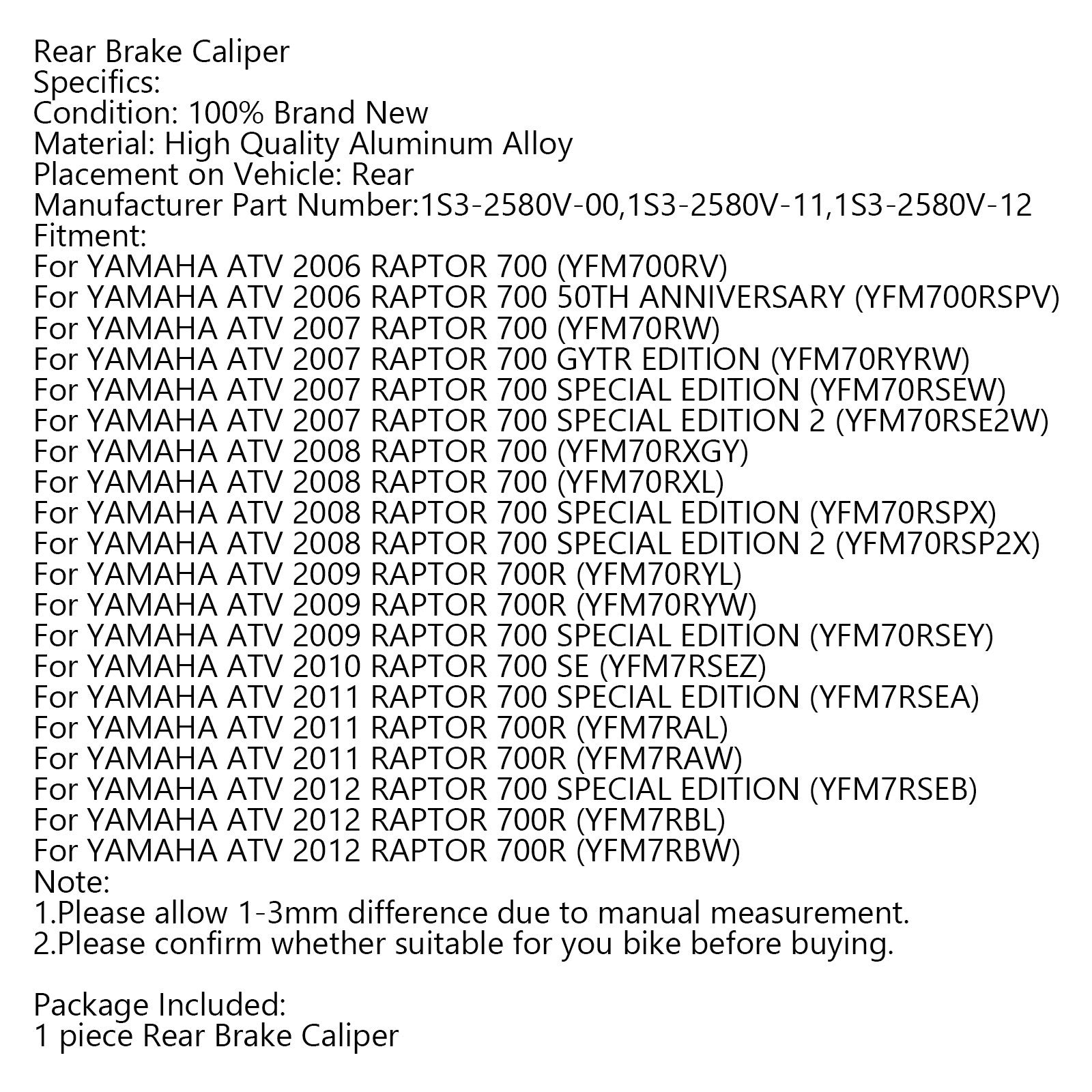 Pinza freno posteriore per Yamaha ATV Raptor 700 700R YFM700R 2006-2012 con pastiglie generiche