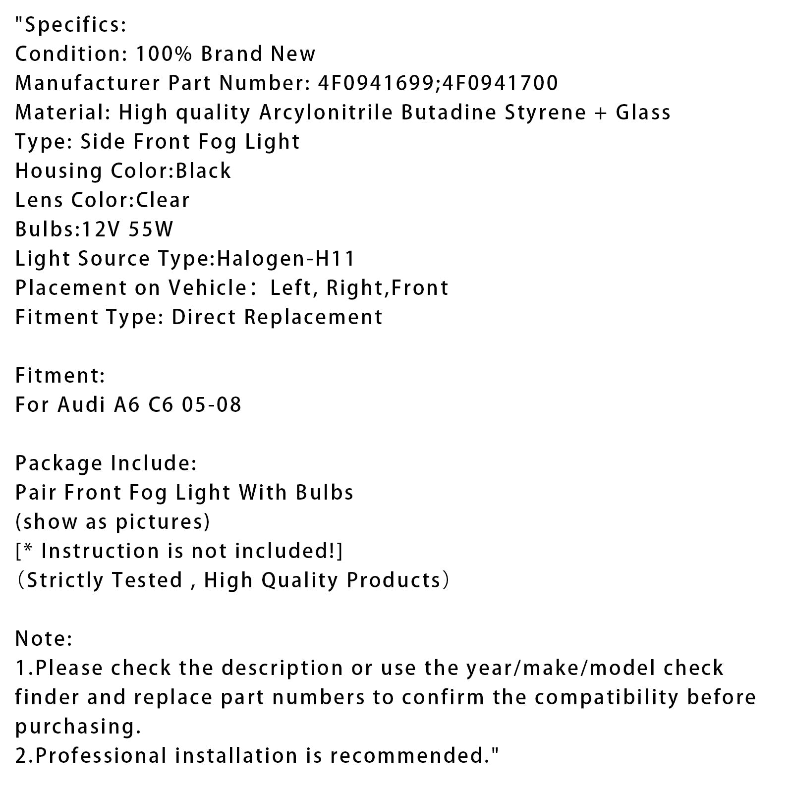 Coppia di fendinebbia anteriori per paraurti per Audi A6 C6 2005 2006 2007 2008