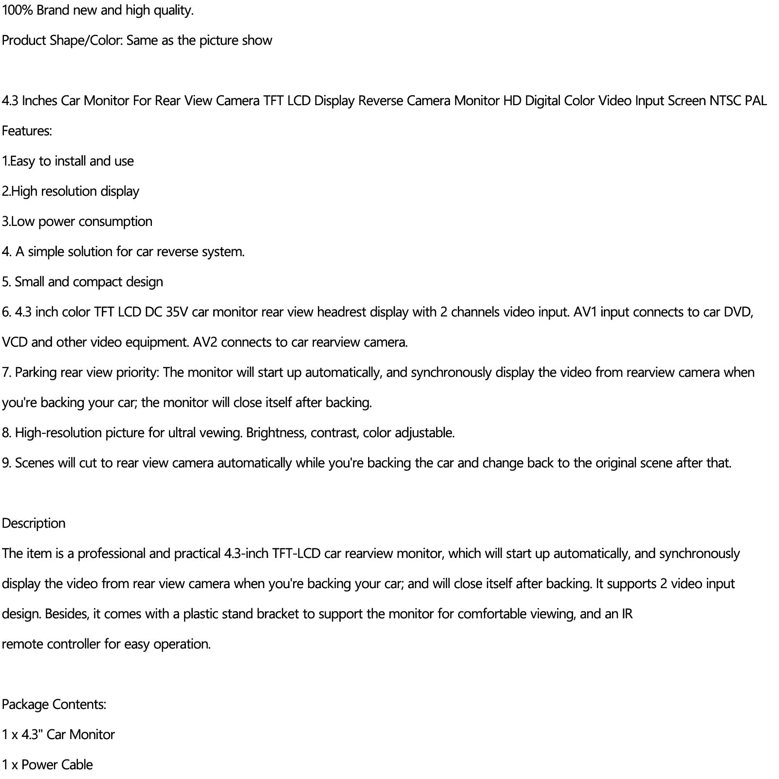 L'articolo è un monitor per retrovisore per auto TFT-LCD professionale e pratico da 4,3 pollici, che si avvia automaticamente e visualizza in modo sincrono il video dalla telecamera posteriore quando si fa retromarcia; e si chiuderà dopo il backup. Supporta 2 progetti di input video. Inoltre, viene fornito con una staffa di supporto in plastica per supportare il monitor per una visione confortevole e un telecomando IR per un facile utilizzo.