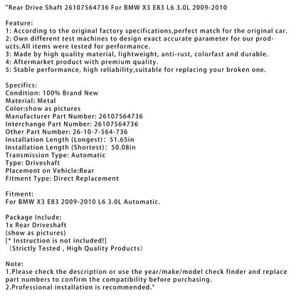 Albero di trasmissione posteriore 26107564736 per BMW X3 E83 L6 3.0L 2009-2010