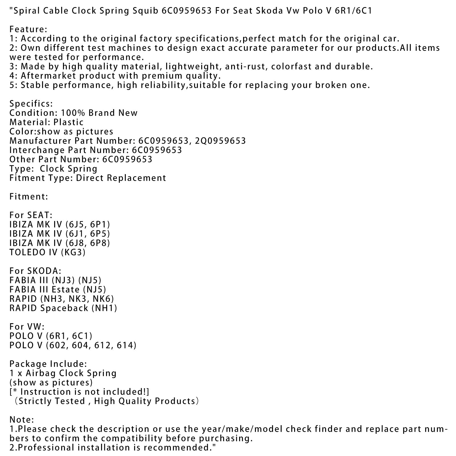 Molla per orologio con cavo a spirale Squib 6C0959653 per Seat Skoda Vw Polo V 6R1/6C1