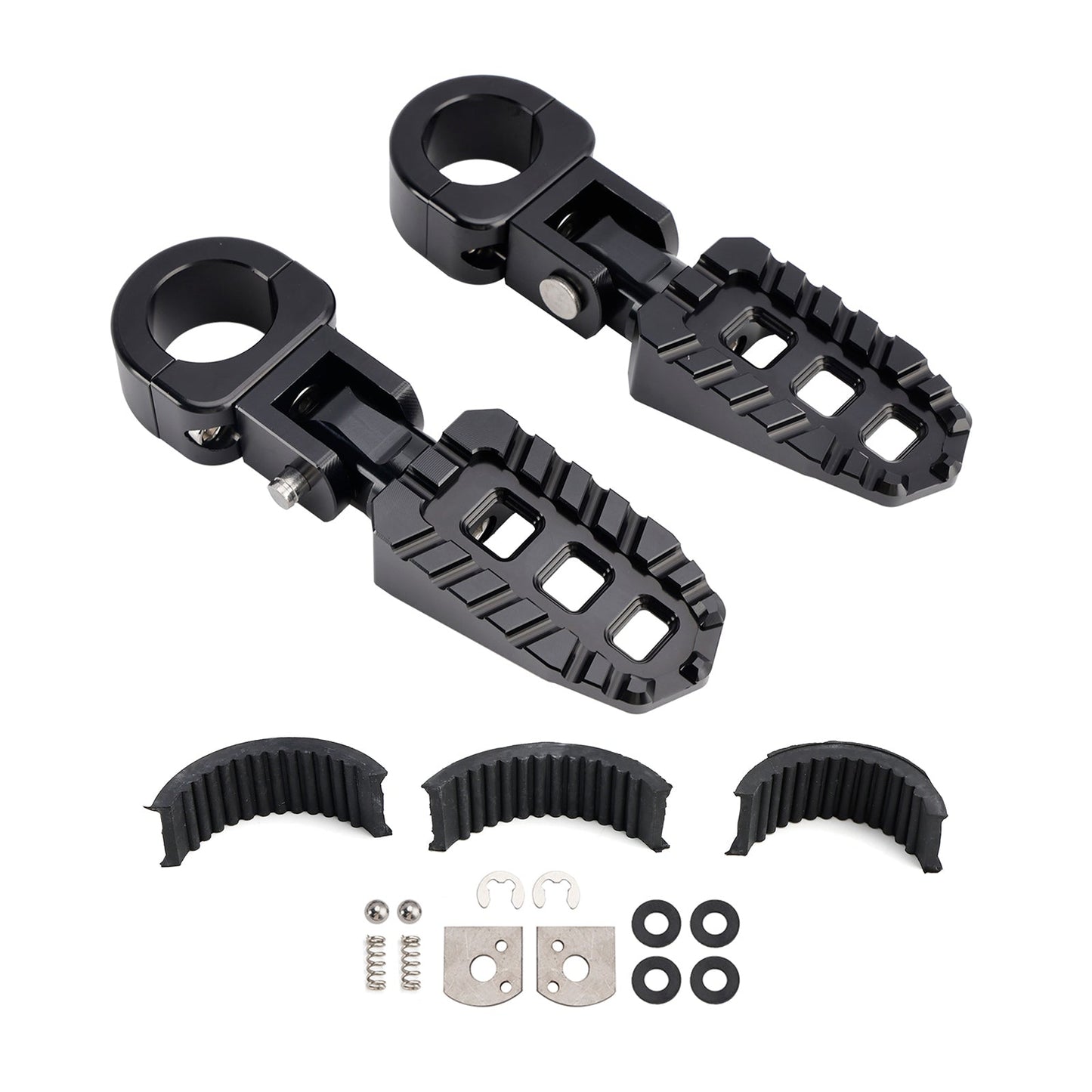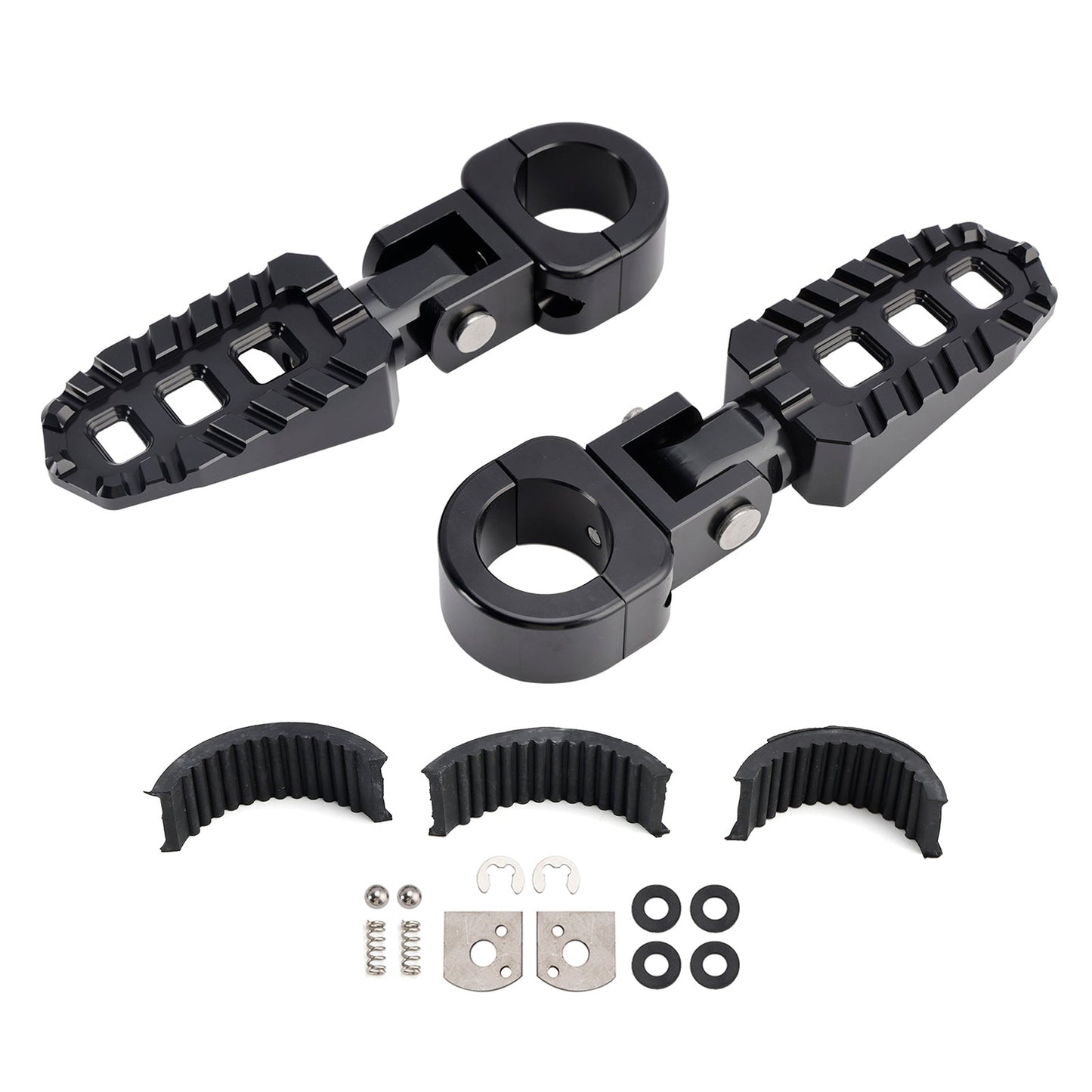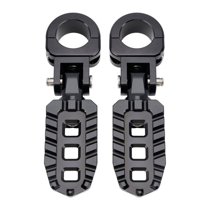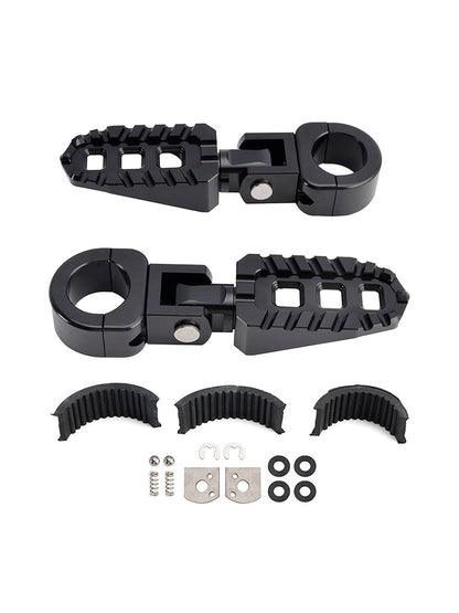 I pedali poggiapiedi Universal Highway Rest possono essere montati su barre da 1 pollice (25 mm), 1,06 pollici (27 mm-28 mm) o 1,25 pollici (31,75 mm) e sono dotati di 3 rondelle in gomma per generare una forza di serraggio sufficiente a impedire ai poggiapiedi di ruotare sulle barre. (Le rondelle in gomma sono necessarie per il montaggio su barre da 1 pollice (25 mm), 1,06 pollici (27 mm-28 mm)). I poggiapiedi possono essere posizionati a qualsiasi angolazione per personalizzare la vestibilità della tua bici e migliorare il tuo comfort.