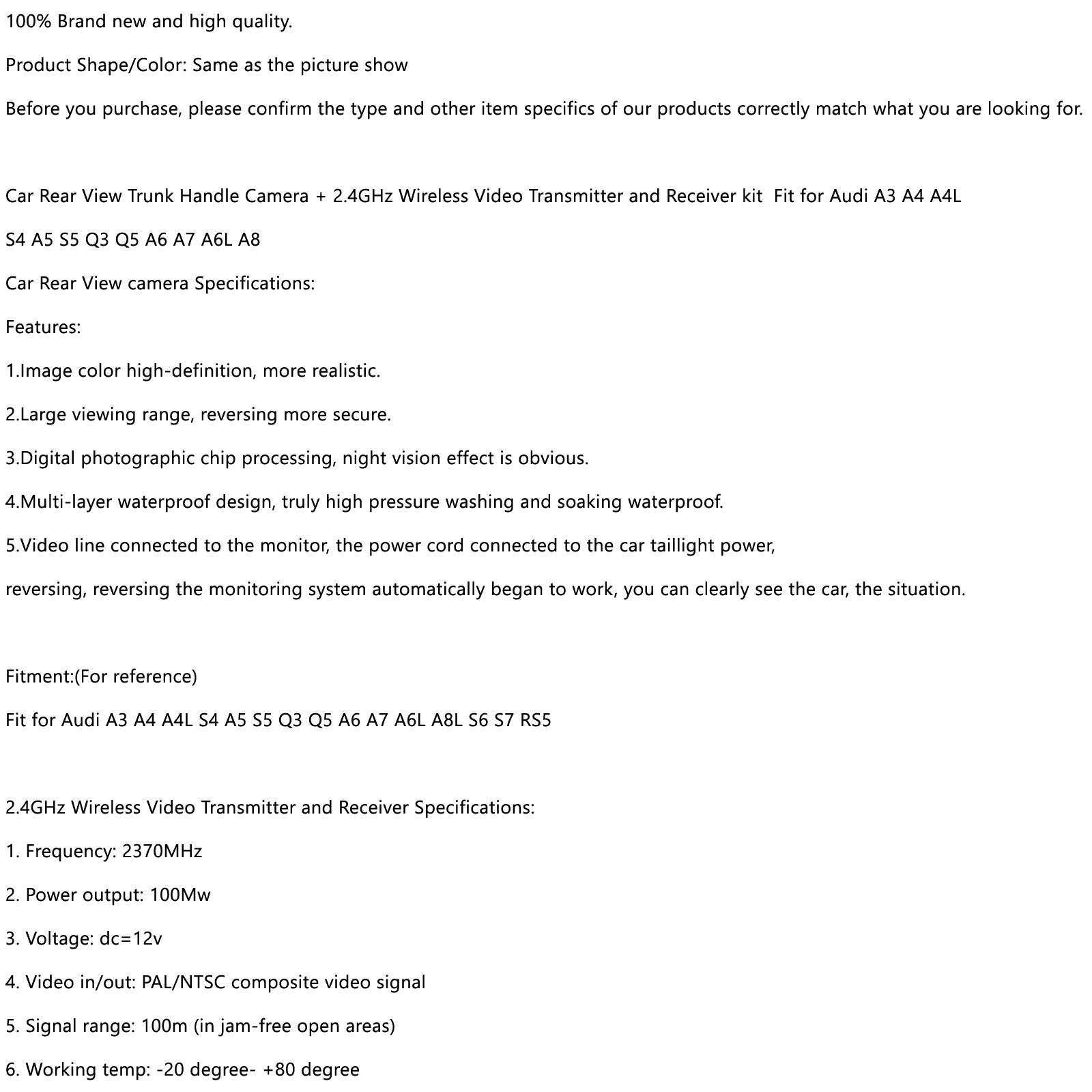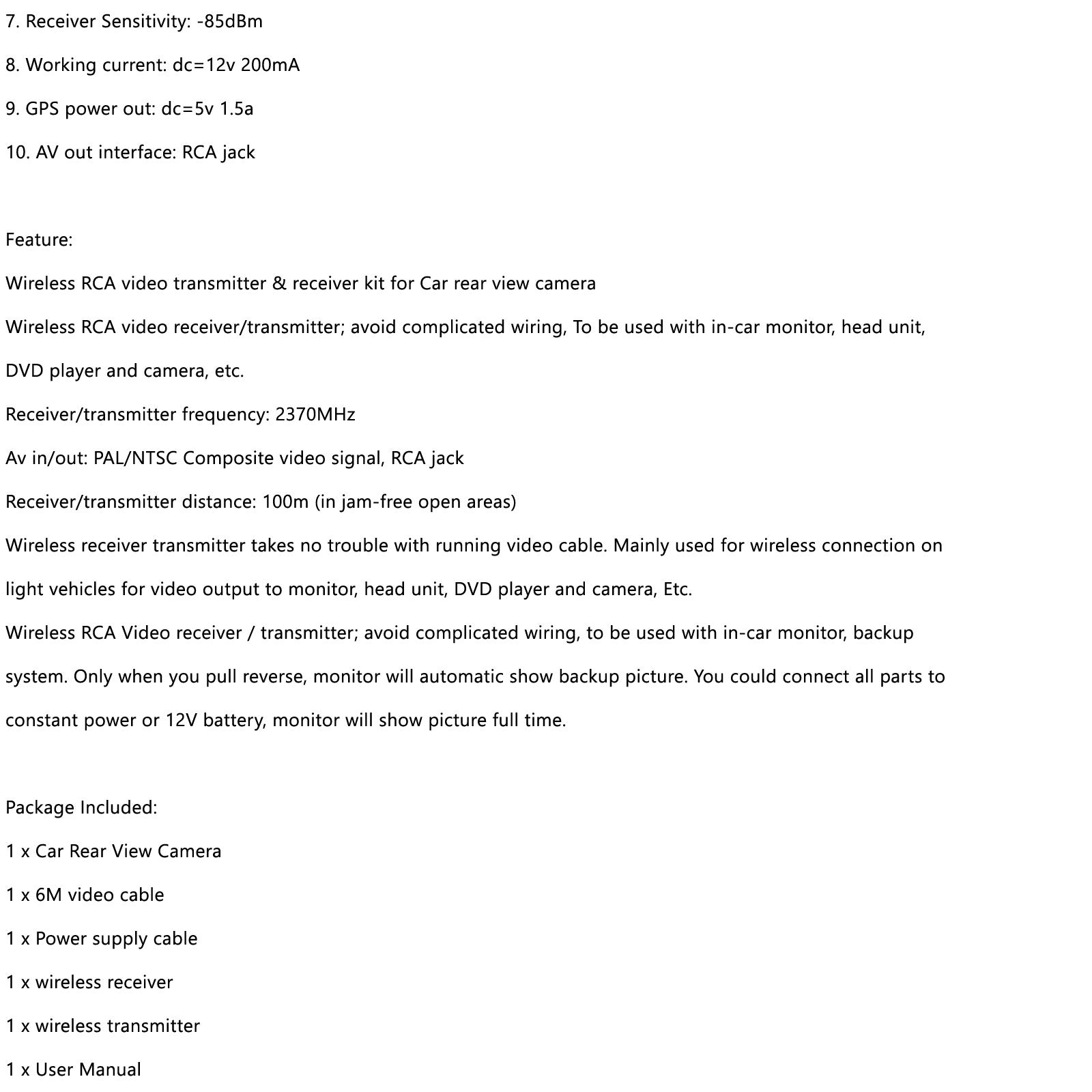 Il trasmettitore del ricevitore wireless non ha problemi con l'esecuzione del cavo video. Utilizzato principalmente per la connessione wireless su veicoli leggeri per l'uscita video su monitor, unità principale, lettore DVD e fotocamera, ecc.